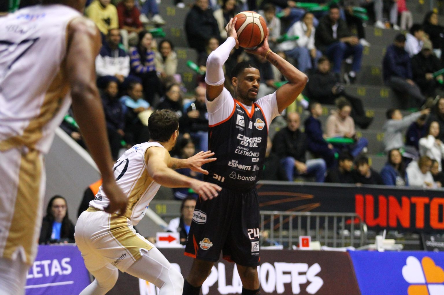 Shamell foi o cestinha do Caxias na partida.Thais Sousa / CXSB,DivulgaçãoNada de aposentadoria ou de eliminação. Na noite gelada desta segunda-feira (27), o Caxias Basquete foi valente, marcou muito e contou com grandes atuações de Shamell e Augusto para vencer o Brasília por 66 a 63, no terceiro jogo dos playoffs no NBB. Com 2 a 1 a favor do time do Distrito Federal na oitavas de final, o quarto jogo do duelo ocorre na quinta-feira (30), na Arena Nilson Nelson, em Brasília. O horário ainda não foi definido.Com Shamell como titular, o Caxias iniciou o jogo encontrando dificuldades e viu o Brasília fazer 8 a 0. A resposta veio com o norte-americano liderando o ataque dos mandantes, em uma corrida de 11 a 3, igualando o placar. O primeiro quarto seguiu equilibrado e acabou com empate em 20 a 20.No segundo período, a marcação dos dois lados prevaleceu durante os 10 minutos. O resultado foi que nenhum dos dois times marcou mais que 11 pontos. Com 11 a 8 na parcial, o Brasília foi para o intervalo na frente: 31 a 28.O terceiro período começou diferente para o Caxias. Em dois minutos, o time fez 9 a 0, virando o placar e superando a pontuação do quarto anterior. Com a alternância na liderança, o jogo seguiu parelho e acabou com novo empate no fim da parcial: 48 a 48.O quarto derradeiro era de tudo ou nada para o Caxias Basquete. E o time não decepcionou. Com o apoio do torcedor, um Shamell vibrante, querendo adiar a aposentadora, e Augusto anotando 14 pontos, o Gambas venceu a parcial por 18 a 15 e fez 66 a 63 na partida.Shamell, com 19 pontos, e Augusto, com 18, foram os cestinhas do time caxiense na partida.