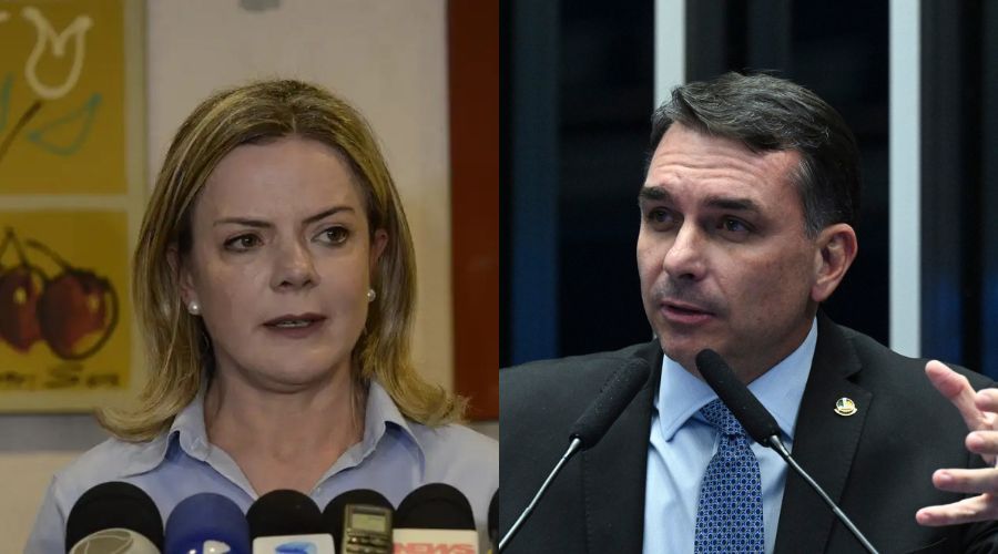 A ministra Gleisi Hoffmann e o senador Flávio Bolsonaro (Rovena Rosa/Agência Brasil e Carlos Moura/Agência Senado/Reprodução)