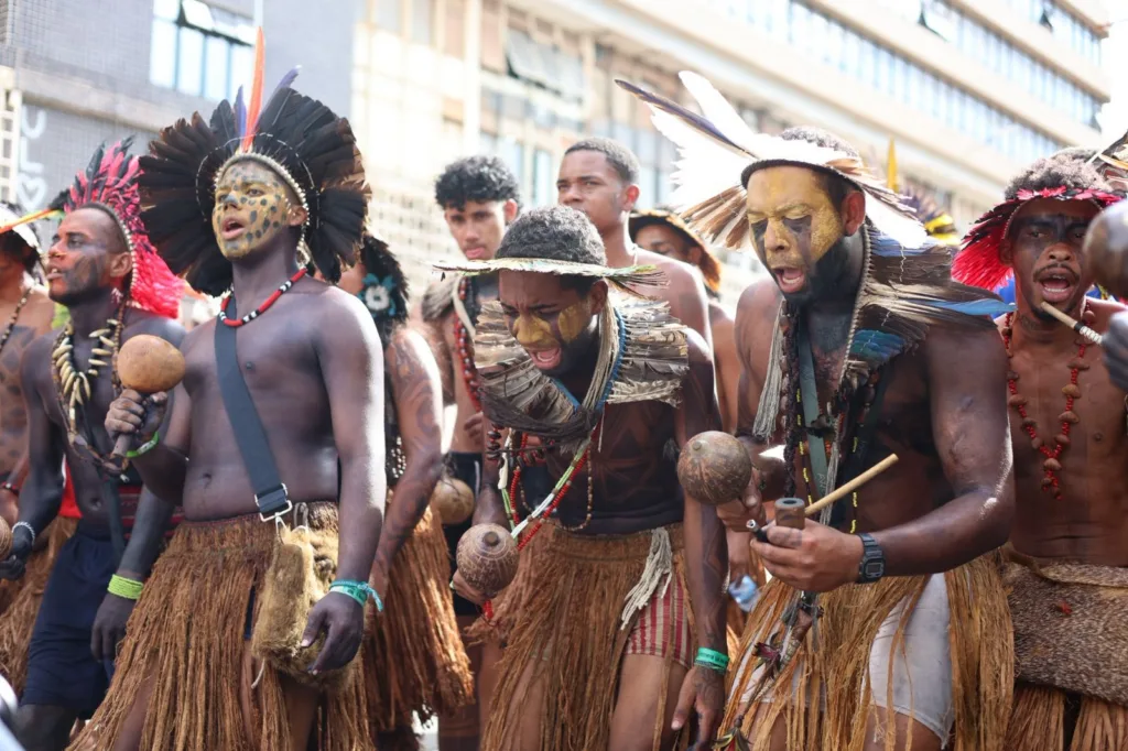 Em marcha, os participantes enfatizaram que a luta por demarcação de terras é inseparável da proteção da cultura, da história e do conhecimento tradicional.